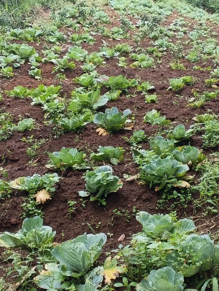 A field of cabbages thrives with varying degrees of maturity, spread across reddish-brown soil