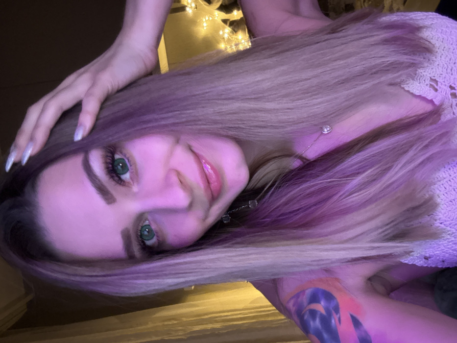 A fair-skinned woman with striking green eyes and lavender-tinged hair smiles. Her manicured hand rests near her forehead. She is wearing a delicate silver necklace and a light-colored, possibly crocheted top. A colorful tattoo is visible on her upper arm. Soft, warm lighting illuminates the scene, with string lights visible in the background. The picture is taken at an angle, with the woman's head tilted.