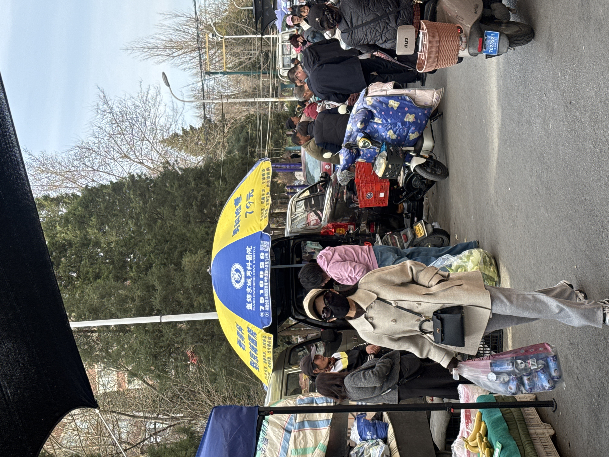 Here is a description of the image: The image shows a street scene in what is likely Guta, China. A group of people are gathered on the side of the street, seemingly at a market or informal trading area. Many people are on motorcycles or scooters. An advertisement for a men's hospital (PANJIN JINGCHENG MEN'S HOSPITAL) is visible on an umbrella; the phone number is 07510999 and mentions an address. A woman in a tan coat, grey pants, black shoes, and a mask is carrying a plastic bag with canned drinks. There are various goods for sale, including fabric and produce. The weather appears to be overcast.