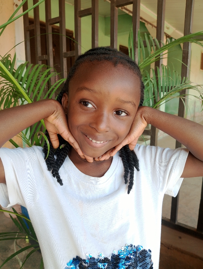 A young, dark-skinned girl is depicted in a medium shot, posing with both hands resting on her cheeks
