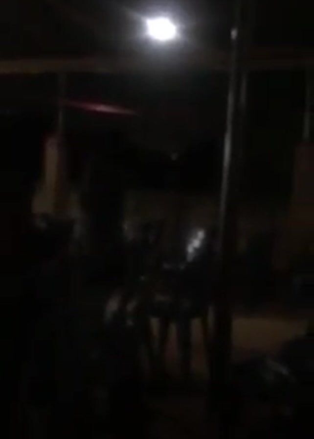 dimly lit outdoor event space at night. Rows of white plastic chairs are set up under a simple roof structure. The only illumination comes from a single bright light overhead. Intermittently, fireworks are set off, illuminating the space with bright flashes of light. People are present in the space, but they are mostly silhouetted and their activities are not clear. The camera is stationary and the scene is mostly still.
