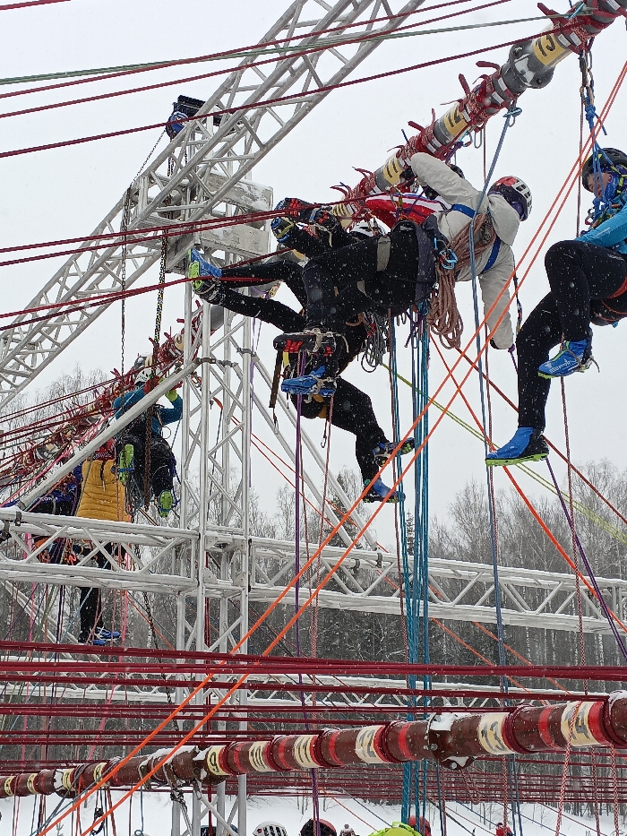 The image depicts an outdoor winter scene in Izhevsk, Russia, characterized by ongoing light snowfall against an overcast sky. The ground and distant bare trees are covered in snow. A prominent multi-level metal truss structure, composed of white interlocking beams, serves as a climbing or obstacle course. Numerous brightly colored ropes (red, orange, purple, blue, green) are strung throughout the structure, attached to various points and extending towards the ground. Several horizontal cylindrical elements, wrapped in red and white tape and bearing numbers (e.g., "13"), are integrated into the course at multiple elevations. At least five individuals are actively engaged on the structure. All are dressed in cold-weather gear, including insulated jackets (black, white, blue, yellow), dark pants, and specialized climbing footwear with brightly colored soles (blue, green). Each participant wears a protective helmet and is secured by a climbing harness from which multiple ropes and pieces of equipment, such as carabiners and ascenders, hang. Three individuals are suspended horizontally or diagonally, manipulating ropes and equipment to traverse the upper sections of the course. One individual in a white jacket and red helmet is notably horizontal. Another person in a blue jacket and blue helmet is suspended more vertically on the far right. A third, largely in black gear, mirrors the horizontal position on the left. A fourth participant, wearing a yellow jacket, is positioned lower on the truss, engaged with a rope system. Additional obscured figures are visible at the base of the structure on the snow-covered ground. The scene captures an active climbing or rope access event under winter conditions.