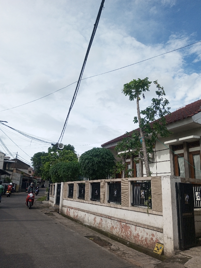 A street scene with a house behind a fence. The house has a tall tree in front, and power lines crisscross overhead. A public address speaker is mounted on a utility pole. A few scooters are driving down the street. The fence is low with ornate black bars. The sky is overcast with white clouds.