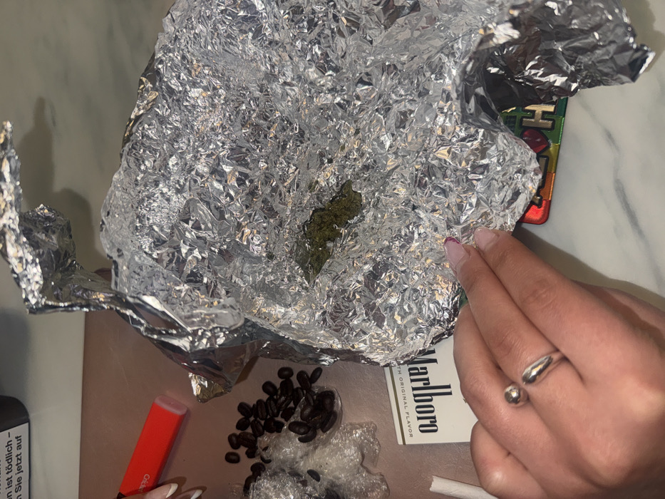 The image depicts an indoor scene in Rueil-Malmaison, France, viewed from an overhead perspective, displaying various items arranged on a light-colored, potentially marble or patterned, table surface. Central to the frame is a large, crumpled piece of aluminum foil, partially unfolded to reveal a quantity of green, leafy plant material, consistent with cannabis. To the left of the foil, a small pile of dark, roasted coffee beans rests beside a clear, crinkled plastic material. Above these items, a red, cylindrical disposable vape pen is visible. In the lower left, an inverted white and red Marlboro cigarette pack is positioned, with a single, rolled white paper, possibly a cigarette or joint paper, adjacent to it. A human hand, exhibiting manicured fingernails with French tips and a purple accent, occupies the lower foreground. This hand wears a silver-colored, open-style ring featuring a spherical and a teardrop-shaped element on the ring finger. The hand rests near the edge of the aluminum foil, partially obscuring a multi-colored object, possibly a tray or grinder, beneath the foil. In the upper left background, a dark object with partially visible white text, reading "jetzt auf," is present. The scene is illuminated by ambient or artificial light.