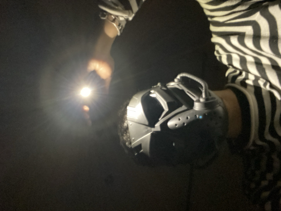 A person wears a black and white striped shirt. In the darkness, they hold a flashlight in one hand. The other hand holds a Darth Vader helmet, which obscures part of their face and hair. The beam from the flashlight illuminates the scene, casting a bright light in the surrounding darkness. The focus is on the contrast between the light and shadow.