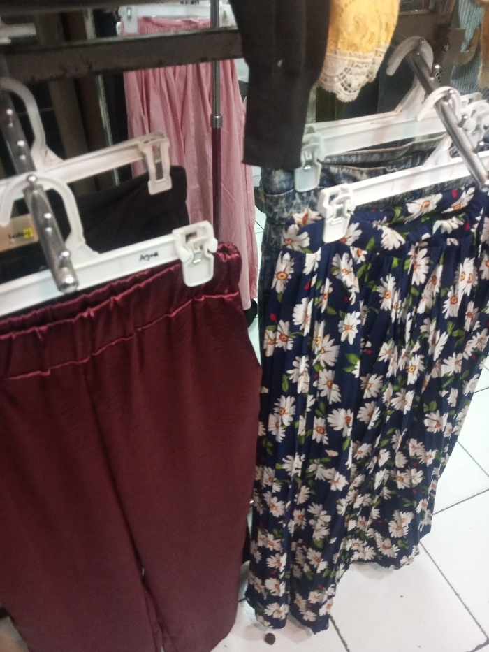 A clothing rack displays two pairs of pants and other clothing. The first pair of pants are maroon-colored with an elastic waistband. The second pair is a long, blue skirt with a white daisy pattern. Additional clothing items are seen hanging behind the pants, including a pink skirt, a black garment, and a yellow lace item. The setting appears to be a clothing store or closet.
