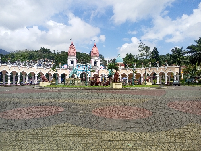 A symmetrical, ornately decorated building stands at the end of a colorful, patterned brick roundabout