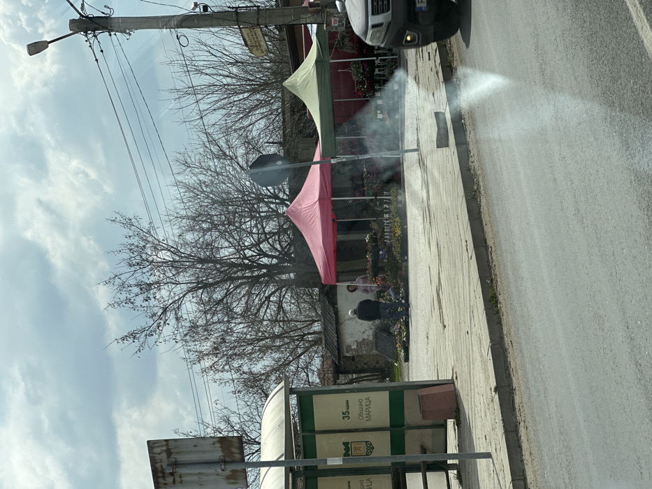 The image depicts an outdoor urban scene in Graf Ignatievo, Bulgaria, under an overcast sky. In the immediate foreground, an asphalt road transitions to a concrete sidewalk and curb. A dark-colored SUV, likely a Nissan, with a partially visible Bulgarian license plate ("РХ"), is present on the far right of the road. Reflections, consistent with a vehicle windshield, are visible across the lower foreground. On the left, a green and white bus stop shelter displays the Cyrillic text "35 ГОДИНИ ОБЩО МАРИЦА" (35 YEARS MARITSA MUNICIPALITY). Adjacent to it stands a corroded, blank metal signpost. Further along the sidewalk, a red concrete block is visible. Two market stalls with temporary canopies are positioned on an unpaved area next to the sidewalk. The left stall has a red canopy, and the right stall has an olive-green canopy. Both display numerous potted plants and flowers arranged at ground level and on low stands. Three individuals are near the stalls: one male, wearing a light cap, dark jacket, and blue jeans, stands with his back to the camera, facing the merchandise; two females are positioned behind the stalls, with one partially obscured by the red canopy. A dark gray pole with a circular sign is situated between the market stalls and the sidewalk. On the right, a utility pole supports multiple overhead wires and features a yellow sign with Cyrillic text, including "КЪЩИ ЗА ГОСТИ АНДРЕЕВИ" (GUEST HOUSES ANDREEVI). In the background, deciduous trees with bare branches are visible against the sky, along with a dilapidated single-story building featuring a corrugated roof.