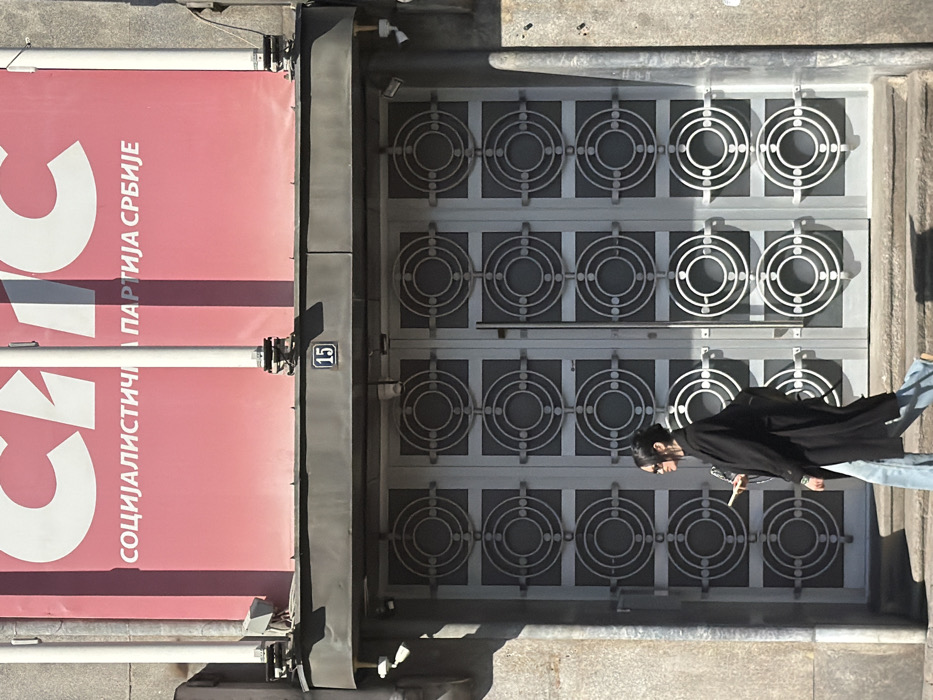 The image depicts the entrance of a building at Bulevar Despota Stefana 15 in Belgrade, Serbia, identified as the headquarters of the Socialist Party of Serbia. A large, red banner with white Cyrillic text "СПС" (SPS) and "СОЦИЈАЛИСТИЧКА ПАРТИЈА СРБИЈЕ" (Socialist Party of Serbia) covers the upper portion of the facade. Below the banner, a dark grey overhang or awning features the building number "15" centered above the entrance, with several white security cameras mounted underneath. The primary subject is a set of double doors constructed from light grey metal, featuring a distinctive decorative pattern of multiple concentric circles arranged in a rectangular grid, three columns wide and at least four rows high. Vertical white pipes are visible on the building facade to the left and right of the banner. The building's exterior appears to be light grey stone or concrete. A single individual, appearing female, is captured in mid-stride, walking from left to right across the lower frame, in front of the building's entrance. She has dark hair styled in a bun, wears dark sunglasses, a long black coat, light blue flared jeans, and light-colored shoes. Her right hand holds a light-colored, rectangular object, possibly a mobile phone. Strong sunlight from the upper left casts distinct shadows.