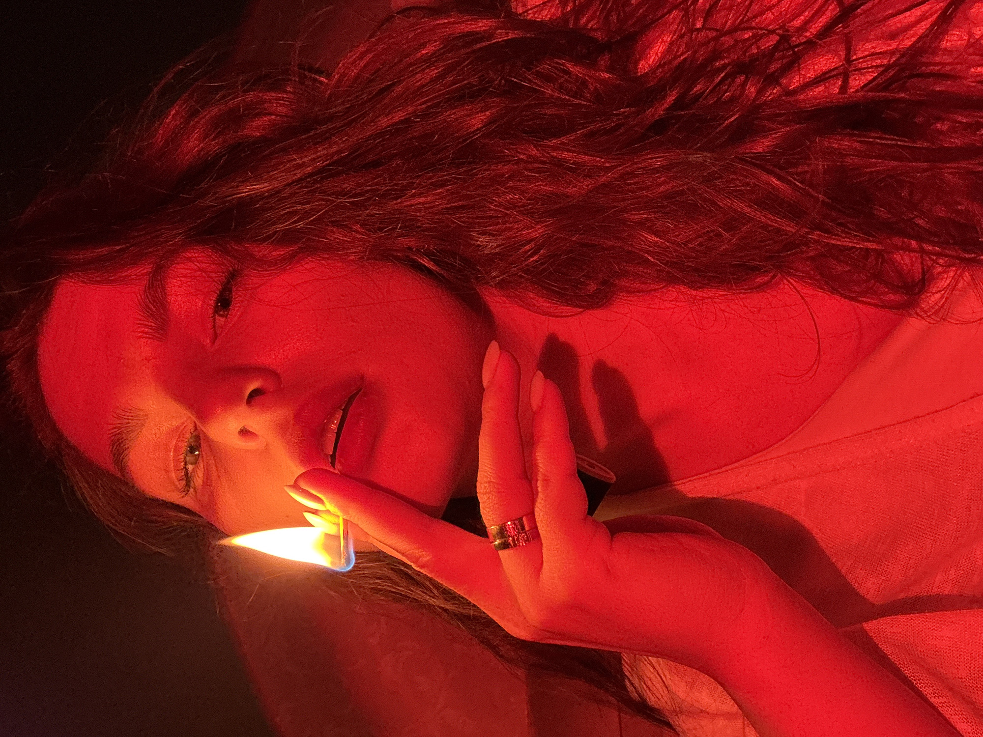 A woman with long, auburn hair is shown in a close-up, low-angle shot. The lighting is intense red, bathing the scene in a monochromatic hue. She is lying down, with her head tilted back, and her gaze directed towards the upper left. Her lips are slightly parted. Her right hand is raised, with her index finger positioned near her mouth, and a flame is illuminated by the fingernail. A ring is visible on her ring finger. She is wearing a light-colored top. The location is unspecified, and there is no indication of being in Chaikovsky, Russia.
