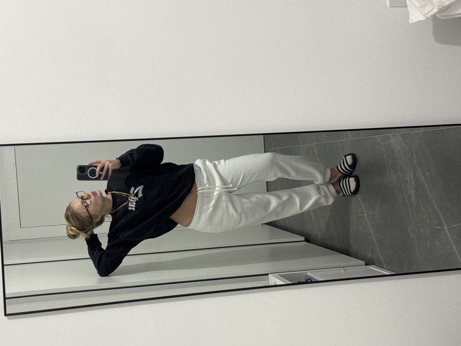 A young woman poses in a full-length mirror. She wears glasses, a black sweatshirt, white sweatpants, and Adidas slides. Her hair is in a bun. She holds a smartphone up to take the photo. The background is mostly white walls with a gray tile floor. A small white drawer unit is visible. The mirror has a black frame.