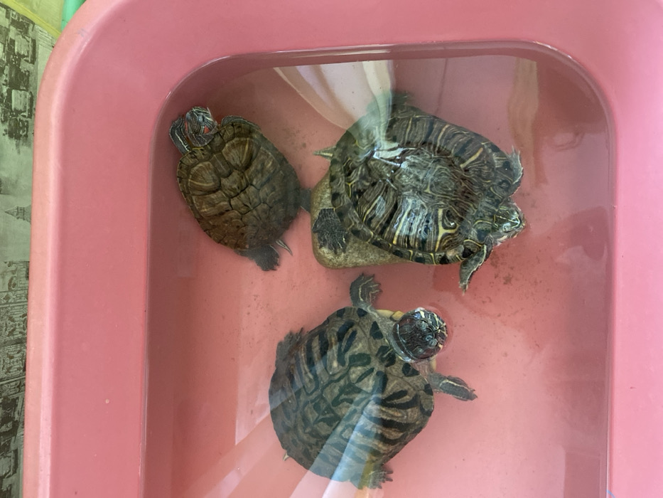 - "In Chaikovsky, Russia, within an unspecified indoor location, three turtles are observed contained within a pink plastic tub" by FM-cdksW2, licensed under CC BY 4.0