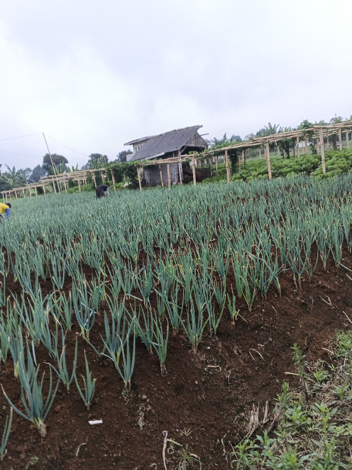 A field of green onions stretches towards a wooden structure with a thatched roof under a cloudy sky. A bamboo trellis system supports plants along the structure's edge. Two figures, possibly workers, are visible in the field, tending to the crops. The foreground shows rows of onions rooted in dark soil, with weeds and grasses along the edge. The landscape suggests a rural or agricultural setting.
