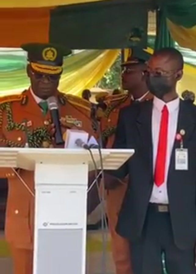 An official in an orange uniform with military decorations and a peaked cap is speaking from a podium, holding a microphone and notes. He is wearing sunglasses. Behind him and to his right stands a person in a black suit with a red tie and wearing a black face mask and glasses. The person has an ID card attached to their suit. Another official in a similar orange uniform stands behind the speaker. The podium is white with a "Wireless Lecture Amplifier" visible on the front. The backdrop consists of draping green, yellow, and brown fabric.