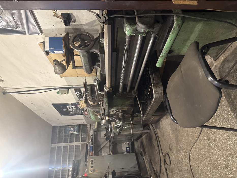 This image depicts a dimly lit industrial workshop located in Sofia, Bulgaria. The primary subject is a large, aged, dark green metal lathe machine occupying the foreground and midground, oriented diagonally from left to right. The lathe features a substantial bed, a lead screw, feed rod, and various controls, handles, and cranks, indicating its operational complexity. A metal tray beneath the cutting area contains dark residue, likely swarf and lubricant. To the left of the lathe, a tall, light gray electrical control panel with multiple dials and switches is visible. Further left, a workbench with various tools and items is discernible against a wall with exposed wooden shelving. The background wall on the left features a large, rectangular, multi-pane window, possibly providing natural light, although the interior appears illuminated primarily by artificial sources. The right-hand wall is a plain, off-white surface, showing signs of wear and minor staining. Several items are mounted or placed on this wall: a dark-framed poster with an image of what appears to be a vehicle (possibly a truck) is positioned above the lathe. Another smaller, faded poster is visible further left on the same wall. High on the wall, a small, light-colored electrical box with a red switch is attached, with a thick black cable running vertically from it upwards. A light blue rectangular box, possibly containing machine parts or supplies, rests on a wooden shelf above the right side of the lathe, alongside a metallic, elongated object that resembles a machine component. The floor is a light gray concrete surface, showing dirt and wear. Several coiled electrical cables and hoses are visible on the floor, suggesting active use. In the immediate foreground, a dark gray office-style chair with a plastic back and seat, supported by black metal legs, is positioned facing the lathe. No individuals are present in the scene, and no active operations or interactions are depicted. The overall environment suggests an active but unkempt heavy machinery workshop.