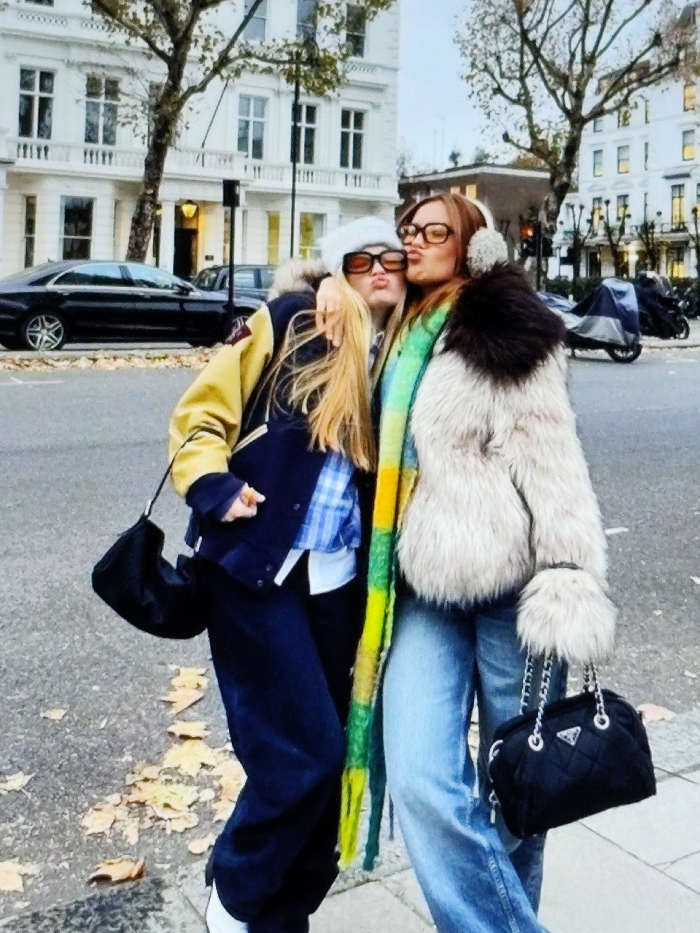 The scene is set on a city street in Oslo, Norway, during daytime in what appears to be autumn or early winter, indicated by bare trees and scattered yellow-brown leaves on the sidewalk. Two young adult females are posing closely together for the camera, both making a "duck face" expression. The female on the left has long blonde hair and wears a white beanie, amber-tinted rectangular sunglasses, a yellow and dark blue varsity-style jacket over a light blue plaid shirt and a white undershirt, dark blue wide-leg pants, and white shoes. A small black shoulder bag is worn over her left shoulder. Her left arm is wrapped around the other female's shoulders. The female on the right has long brown hair and wears light grey earmuffs, dark-rimmed glasses, a light beige/grey faux fur coat with a contrasting dark brown collar and fur-cuffed sleeves, a multi-colored (green, yellow, orange, blue) striped scarf, and light blue jeans. She carries a black quilted Prada handbag with silver chain straps in her right hand, and her right arm is around the waist of the female on the left. In the background, a dark-colored sedan, consistent with a black Audi A8 L, is parked on the left side of the street. Several motorcycles or scooters, covered with dark protective tarpaulins, are parked further down the street on the right. The street is lined with multi-story, light-colored residential or commercial buildings featuring balconies and classical architectural details. The pavement is grey asphalt, and the sidewalk is grey concrete.