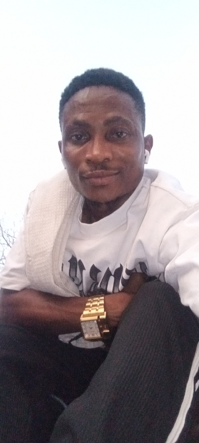 A dark-skinned man poses for a selfie, wearing a white t-shirt with black gothic lettering and black pants with a white stripe
