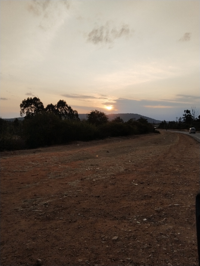 The image depicts an outdoor landscape in Kola ward, Kenya, at what appears to be sunset. The foreground consists of an expanse of reddish-brown, dry, uneven earth containing scattered small rocks and minimal plant debris. A dense line of dark green and shadowed trees and shrubs forms the mid-ground, silhouetted against the ambient light, obscuring the base of distant, rolling hills. The sun, a bright yellow-orange disc, is positioned low on the horizon, partially veiled by thin clouds and the distant topography. To the right, a paved, dark grey asphalt road curves into the background. A light-colored vehicle, resembling a white van or car, is visible on the far right edge of the road, facing away from the viewer. A second, darker vehicle, possibly a bus, is further down the road, partially obscured by foliage. The upper sky displays pale grey and white hues with scattered, thin cloud formations. No human subjects are discernible.
