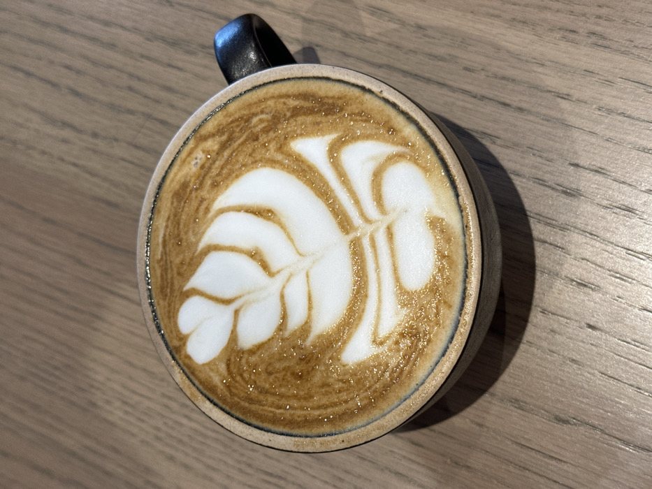 A top-down shot shows a latte in a ceramic mug with a dark blue rim