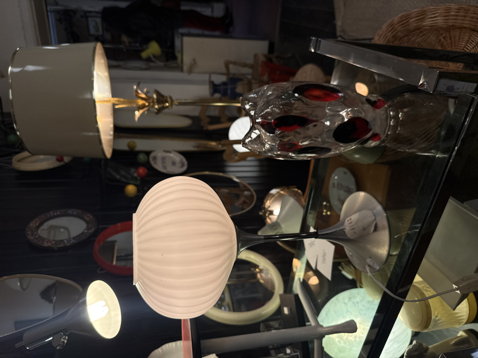 The image depicts an indoor scene within a vintage or antique shop located in Brussels, Belgium. The primary focus is on a display of lighting fixtures and decorative objects on and around a glass-topped shelf. In the immediate foreground, a clear glass shelf holds various items. On the left, a prominent white table lamp features a vertically ribbed, spherical glass shade on a slender silver, tulip-shaped base. A white price tag is attached to the base of this lamp. To the right of the table lamp, a clear glass vase with irregular internal patterns of red and black is displayed. Below the glass shelf, a light green frosted glass dome lamp and a yellow cylindrical container are partially visible. In the midground, behind the prominent table lamp and vase, a tall brass floor lamp stands with an ornate, possibly lotus-petal-inspired base and a light beige drum lampshade, which is illuminated from within. To the far left, a wall-mounted metal lamp with a cone-shaped shade and a visible spiral filament bulb casts light downwards. The background features dark vertical wall panels adorned with multiple mirrors of various shapes, including oval and round designs, reflecting parts of the room. To the far right in the background, a person, largely obscured and wearing dark clothing, is partially visible near a doorway or archway. Only their lower body and a dark coat are discernible, suggesting they are moving or standing within the shop. Other indistinct objects and reflections are present throughout the background. The overall lighting is subdued, with artificial light sources providing specific illumination to the displayed items.