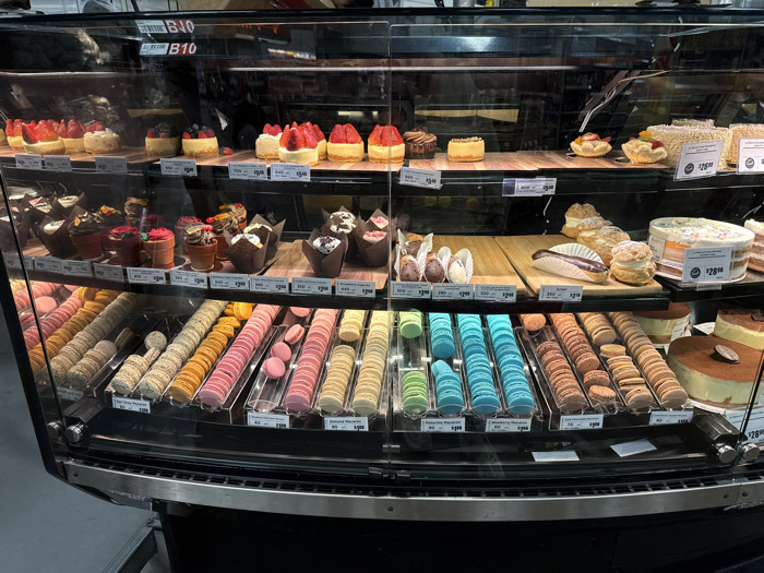 This image depicts the interior of a refrigerated display case filled with various desserts, located within a food retail establishment in McAllen, United States of America