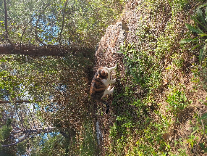 A calico cat, featuring white, orange-brown, and black fur patches, is documented outdoors in Petrovac na Moru, Montenegro. The animal is positioned on an uneven patch of earth, sparse green grass, and dry foliage, oriented slightly right with its head lowered, appearing to sniff the ground. A white collar with a small tag is present around its neck. The immediate environment comprises a mixture of low-lying green vegetation, dry leaves, and exposed soil. A small, dark rock formation is visible to the cat's right. The background is densely vegetated with coniferous trees, likely pines, and various green bushes under bright sunlight. A light blue expanse, consistent with either clear sky or a distant body of water, is visible through breaks in the tree canopy. The scene depicts a natural, unmaintained forested or scrubland area, indicative of a coastal hillside or parkland.