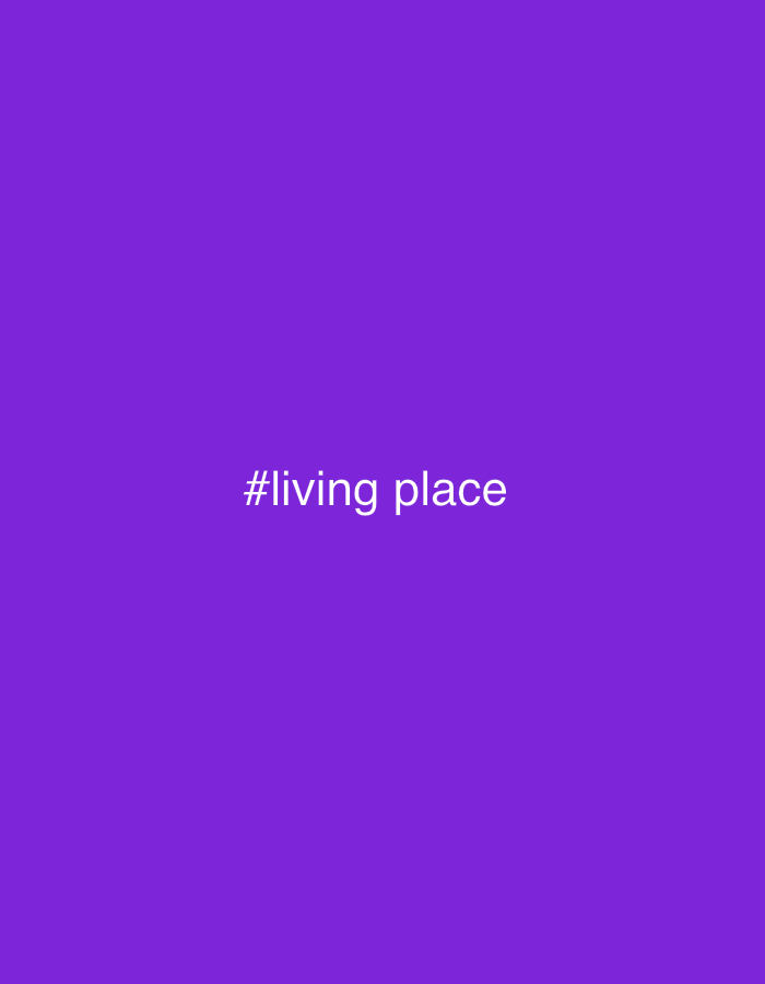 The image is a solid, saturated shade of purple. Centered in the frame is the white text string "#living place." The simple composition focuses attention on the phrase, making it the dominant element. The purple background provides a strong contrast to the white text, enhancing readability.