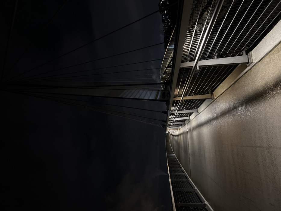 A low-angle shot features a modern bridge at night. The right side reveals a textured walkway with a metal grate and a dimly lit wall. The left side is dominated by darkness and suspension cables. In the distance, faint city lights are visible. The image's composition and lighting create a sense of disorientation.