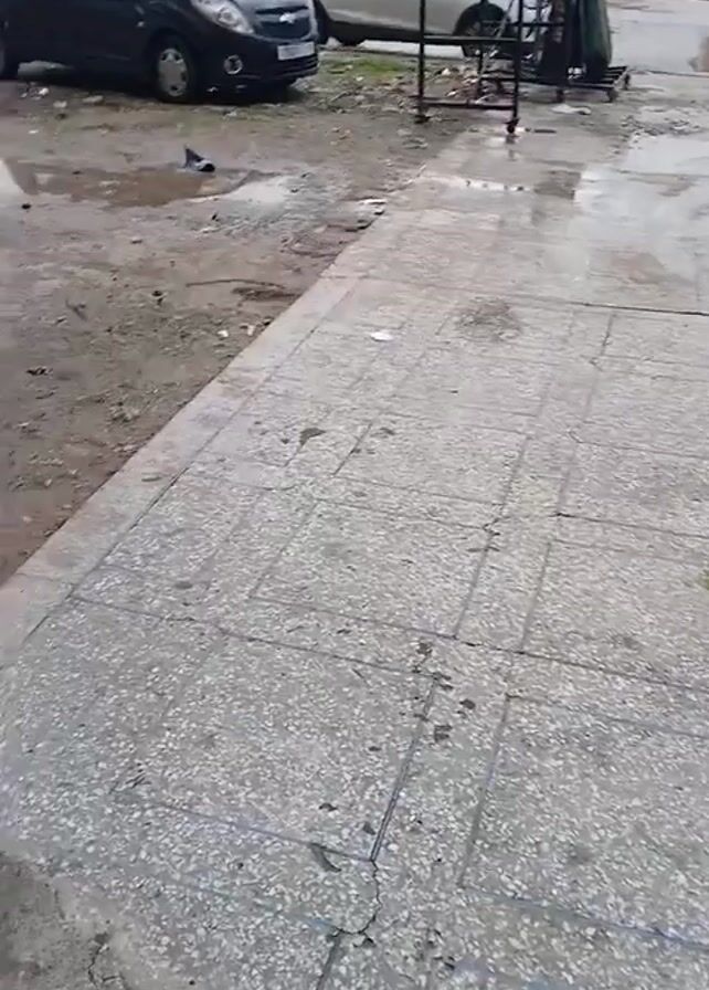 street scene in an urban area, likely filmed on a rainy day. The ground is wet, and there are puddles on the pavement and in the dirt area next to the sidewalk. Several cars are parked in a disorganized manner in the dirt area. The camera moves slightly, panning across the scene. In the background, there are apartment buildings and other structures, suggesting a residential or commercial zone. A black metal structure, possibly part of a market or display stand, sits on the edge of the dirt area near the sidewalk. No people are clearly visible in the frame. The sky is overcast, further indicating wet or dreary weather conditions.