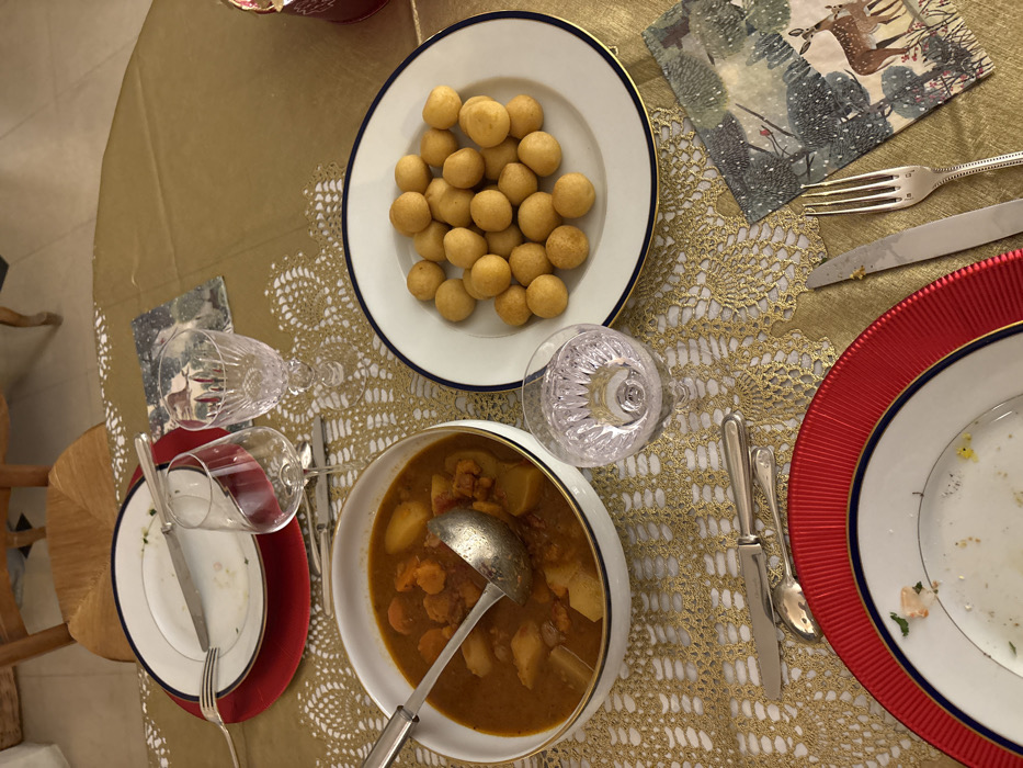 A table setting features a bowl of stew with a ladle, a plate of small round dumplings, and two place settings with used plates