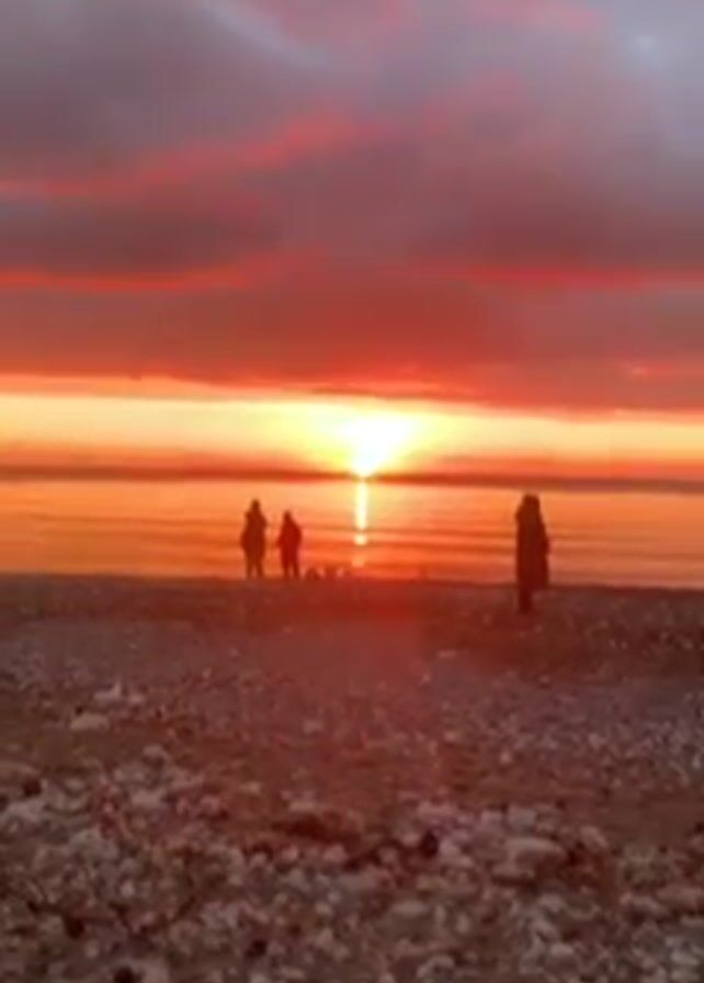 The video depicts a vibrant sunset scene on a rocky beach. The sky is filled with hues of orange and red, with some grey clouds overhead. The sun is setting over the water, creating a bright reflection on the surface. Several silhouetted figures are standing on the beach, looking out at the sunset. The beach is covered in small rocks and pebbles, with some scattered dry vegetation. The camera angle shifts slightly, changing the composition of the scene and the placement of the figures within the frame.