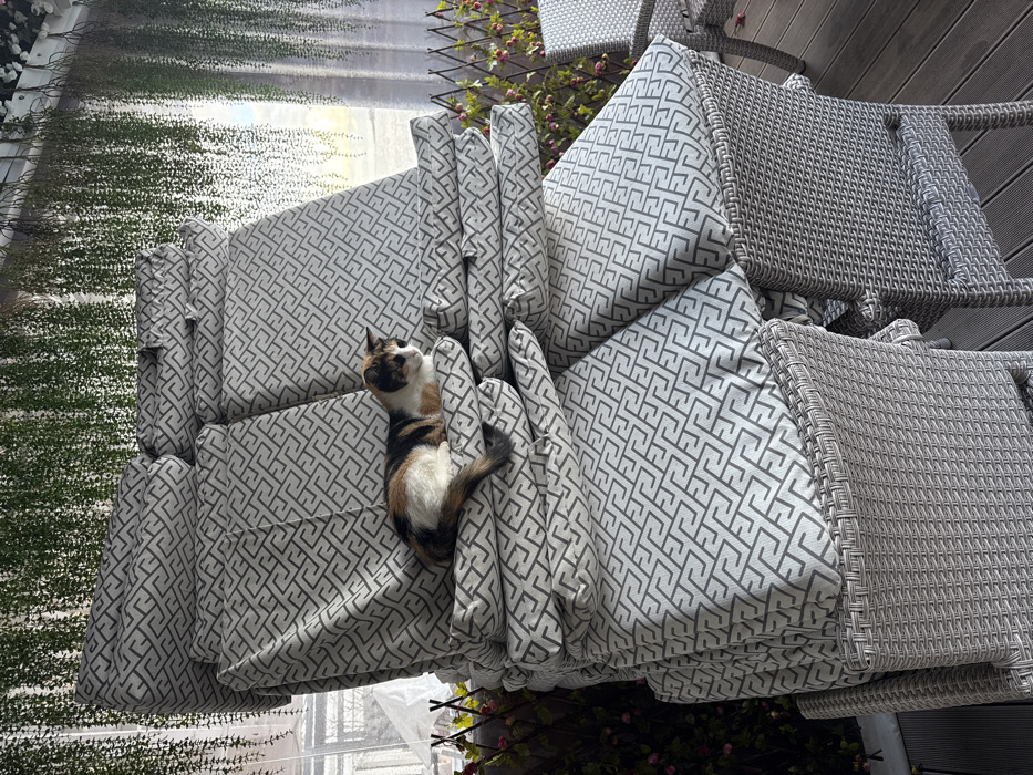 - "In Budva, Montenegro, a calico cat, exhibiting patches of white, orange, and black fur, is observed resting on a tall stack of outdoor furniture cushions" by FM-ruM6v2, licensed under CC BY 4.0