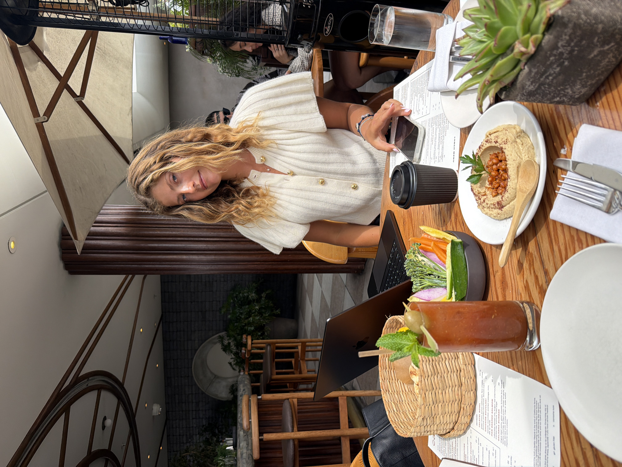 The image depicts a woman with long, curly blonde hair seated at an outdoor dining table, presumably at a restaurant in Santa Monica, California, USA. She is wearing a cream-colored, button-down sweater and is holding a smartphone in her right hand. Her laptop is open on the table next to her. The table is set with various food items, including a plate of hummus, a vegetable platter, and a Bloody Mary cocktail in a woven basket. A coffee cup, a water glass, cutlery, plates, napkins, and a potted succulent are also on the table. A menu is visible on the table. The setting appears to be an open-air restaurant patio with an umbrella overhead. There is a gas heater in the background and glimpses of other patrons seated nearby. The scene is well-lit, suggesting it is daytime. The architecture of the building and the surrounding greenery indicate an upscale and relaxed atmosphere.