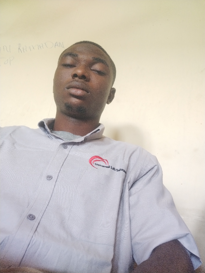 A dark-skinned man with short hair is angled downward, facing the camera with slightly closed eyes and a calm expression. He wears a light gray collared shirt with short sleeves. On the upper left of the shirt is an emblem that reads "Universal Lift Solutions". The background is an off-white or light beige wall. On the wall behind him, faint writing is visible in the upper left corner.