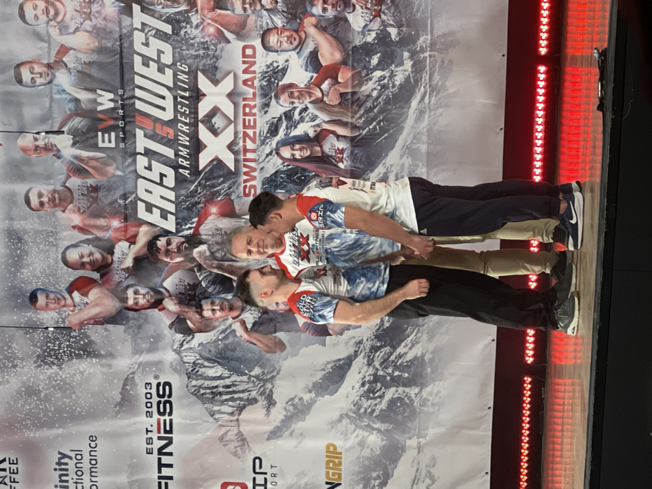 The image depicts three males on a stage in Bülach, Switzerland, positioned in front of a large, multi-panel banner for an arm wrestling event