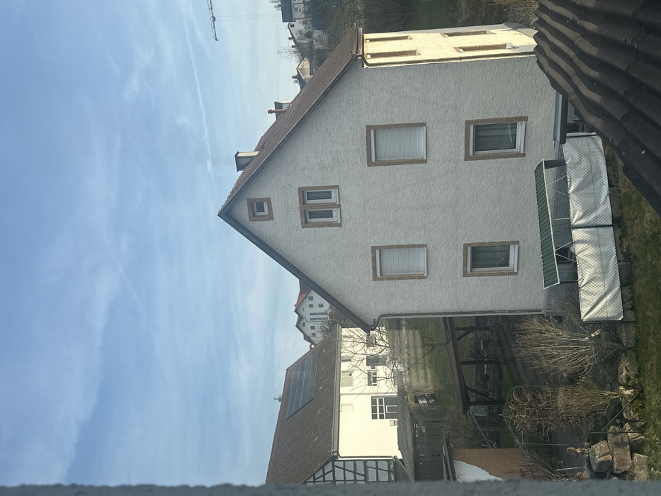 This image depicts a residential scene in Krauchenwies, Germany, viewed from an elevated perspective under a clear blue sky with faint cirrus clouds and contrails
