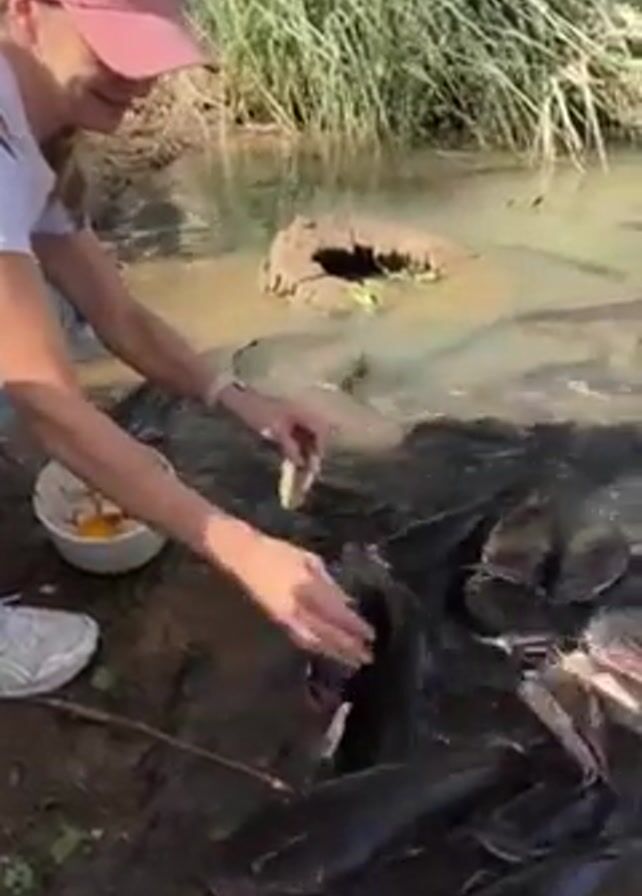 A woman in a pink baseball cap and sunglasses is squatting at the edge of a pond, feeding a large group of dark-colored fish. She is holding a white bowl containing food in her left hand and using her right hand to break off pieces and feed the fish. The fish are clustered together, eagerly waiting for the food. The pond is surrounded by vegetation, and the ground is muddy.