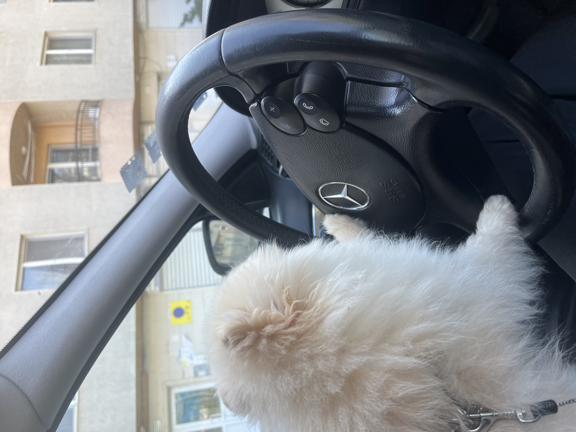 The image captures an interior view from the driver's seat of a Mercedes-Benz vehicle, looking out through the windshield onto an urban street. A small, fluffy, white-coated dog, likely a Pomeranian, is positioned in the driver's seat with its back to the camera, its right paw resting on the black steering wheel. The steering wheel bears the Mercedes-Benz emblem, "SRS AIRBAG" inscription, and integrated control buttons on its right spoke. A silver metallic leash clip is visible on the dog's left side. Below the steering wheel, a leg in dark clothing, indicating a human presence, is partially visible. The exterior environment depicts a street scene in Varna, Bulgaria. Directly across the street, multi-story buildings with light-colored facades are visible. These structures feature multiple windows and at least one curved balcony with a dark railing. A yellow circular sign with a blue interior and a red diagonal line, indicating a parking restriction, is affixed to a building or pole across the street. The scene is under daylight conditions.
