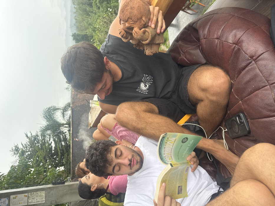 Two men are captured in an outdoor setting. One in a white shirt reads a book titled "The Power of Now" by Eckhart Tolle. The other, in a dark tank top, holds a small statue. A third person in a pink shirt is partially visible between them. They are seated near a large, brown leather beanbag chair. A black smartphone and white charging cord rest on the chair. Green foliage and buildings can be seen in the background.