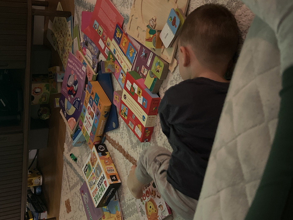 A young child sits on a rug surrounded by books and toys. The child wears a dark gray shirt and light gray pants. The rug has a light-colored pattern. Books of various sizes and colors are scattered around the child, along with a wooden puzzle. A couch with a white and green patterned blanket sits to the right. A bookshelf is visible in the background, filled with more books and toys.