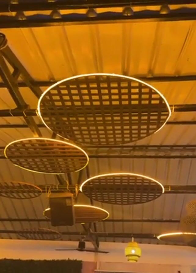 underside of an outdoor shelter or patio. The roof is metallic and corrugated. Hanging from the roof are several decorative elements including circular, woven, lattice-like patterns ringed with warm-toned lights, lantern-style lights, and a black rectangular box. A fan can also be seen attached to the roof. Below the ceiling are hints of a restaurant setting, possibly including greenery and other decorations. The lighting in the scene is warm and predominantly yellow.