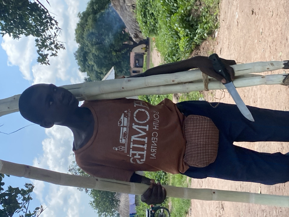 An outdoor, eye-level shot in Zaki Biyem, Nigeria, depicts a young male of dark complexion, appearing to be in his late teens or early twenties, standing under a partly cloudy blue sky. He wears a rust-colored short-sleeved t-shirt with the inverted white text "HOMIES SOUTH CENTRAL" and dark blue trousers. A brown and white checkered fanny pack is secured around his waist. He holds several light-colored, likely peeled bamboo or cane poles in both hands; three are visibly bundled with twine in his right hand. His right hand also grips a fixed-blade knife with a dark handle, positioned with the blade pointing downwards between his hand and the poles. His gaze is directed to his right. The background features a dirt ground surface, dense green vegetation, and several rural structures, including a thatched-roof hut on the right with visible smoke, and other distant buildings. Laundry hangs on a line in the far left background, and a partial view of a bicycle is also present on the left. A distant figure in yellow is visible under a tree on the right side of the background.