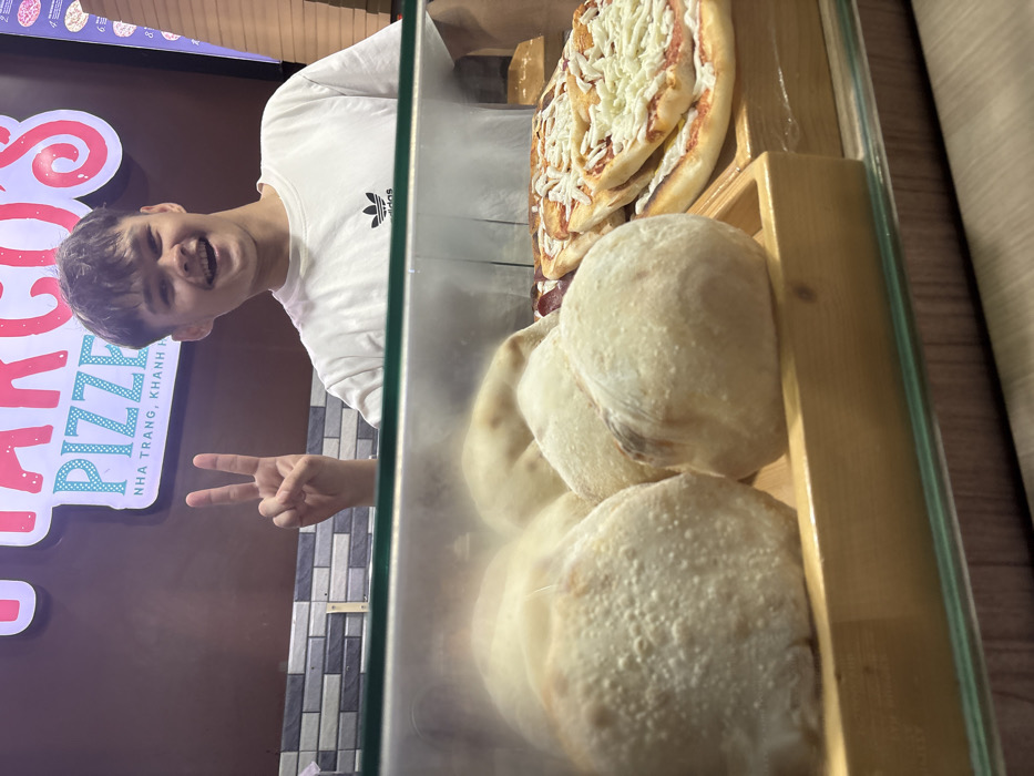 A young male is positioned behind a glass-fronted food display counter at Marco's Pizzeria in Nha Trang, Khánh Hòa, Vietnam
