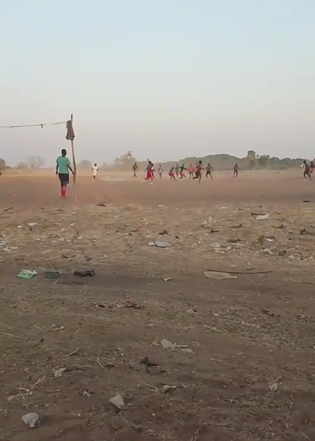 soccer game being played on a dirt field