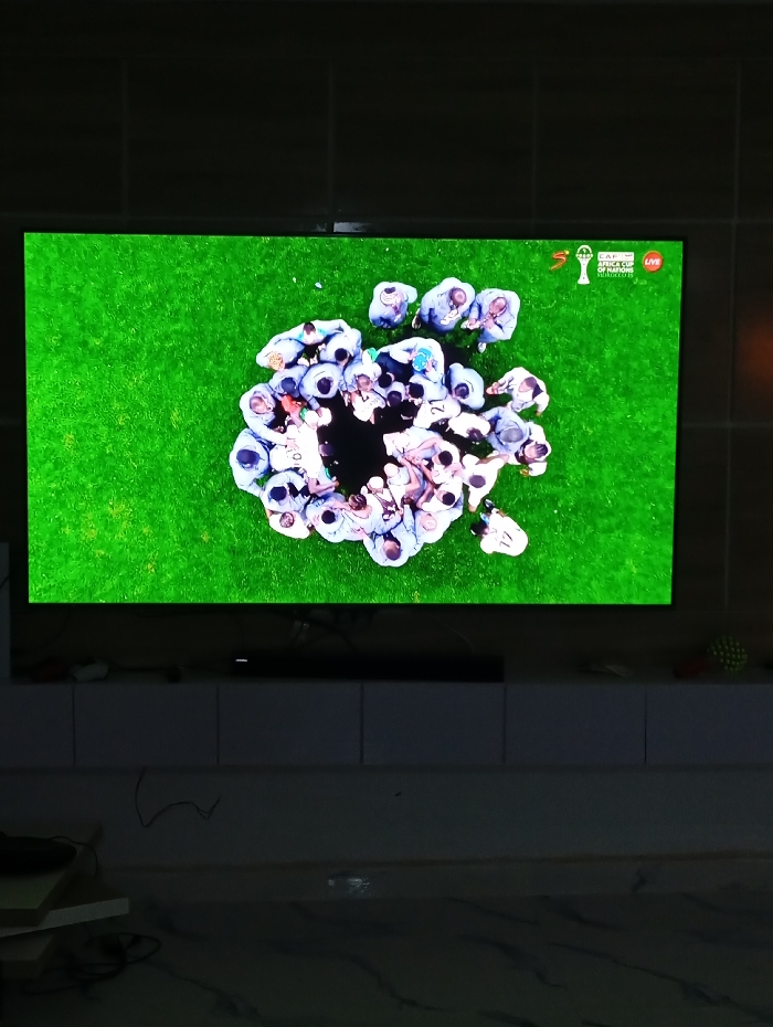 A TV screen displays a live broadcast of the Africa Cup of Nations football tournament