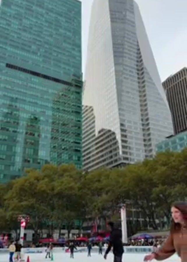 n outdoor ice-skating rink with several people skating. The rink is surrounded by trees and spectators. In the background are tall buildings, including one with a green glass facade and another that is angled. A woman and a young child walk onto the ice. A man wearing a black jacket and black pants is skating, slightly bent at the knees. Cones are placed around the rink. The sky is overcast.