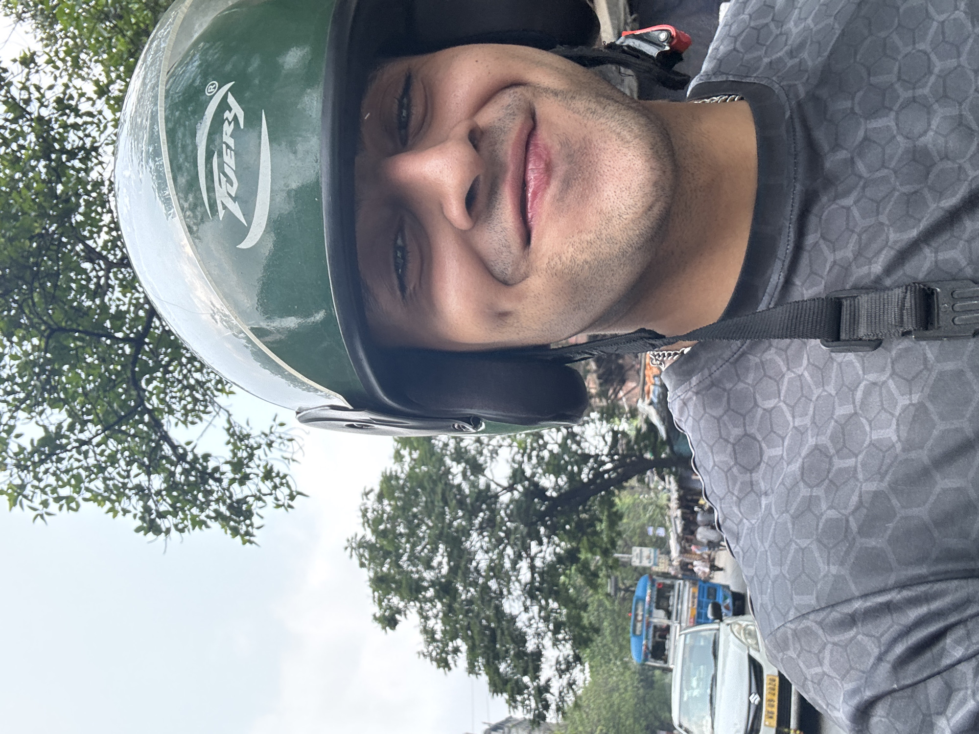 A headshot of a man with tan skin and dark hair wearing a green helmet with the word "FUERY" written on it. The helmet has a clear visor. The man is smiling slightly. He is wearing a grey shirt with a hexagonal pattern. A strap is visible across his chest. In the background, partially obscured by trees, is a street scene in Kolkata, India. Vehicles, including a blue bus, are visible on the street. The sky is overcast. License plate numbers, while present, are too blurry to be discernible.