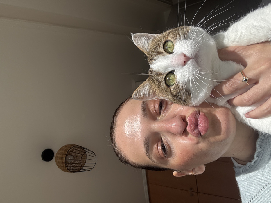 The image displays an indoor, head-and-shoulders, selfie-style portrait of an adult female holding a domestic cat. **Location:** The setting is an interior room, likely a residence. No specific architectural or environmental markers are present to confirm the location as Anavissos Municipal Unit, Greece. **People:** One female individual is visible on the left side of the frame. Her hair is pulled back, revealing her face. She has light brown eyebrows and a slightly flushed complexion. Her eyes are partially closed or squinted, and her lips are pursed in a "kissing" pose. A small hoop earring is visible in her left ear. She is wearing a light blue, textured garment, possibly a sweater. Her right hand, wearing a gold-colored ring with a dark central stone surrounded by smaller clear stones on the ring finger, is holding the cat. **Subjects/Objects:** - **Cat:** A domestic shorthair cat occupies the right side of the frame. It has white fur with brown tabby markings on its head and ears, and distinct green eyes. Its face is directed slightly upward and forward. Prominent white whiskers extend from its muzzle. The cat appears calm and is held by the woman's right hand. - **Ring:** A gold-toned ring with a dark, possibly black or blue, central stone surrounded by small clear stones is visible on the woman's right ring finger. - **Light Fixture:** In the upper left background, a ceiling-mounted light fixture with a woven wicker-like shade around a bulb and a black base is visible. - **Cabinetry:** Partially visible behind the woman's left shoulder is light brown or wooden cabinetry, suggesting a household interior. **Actions/Interactions:** The woman is holding the cat, posing for a close-up photograph. Her facial expression is characterized by pursed lips. The cat is held securely and appears to be looking slightly above the camera's lens. **Environment:** The scene is brightly lit by what appears to be natural light, possibly sunlight, coming from the front-right, creating highlights on the subjects' faces and fur. The background consists of a plain light-colored ceiling/wall and partially visible light-toned wooden cabinetry.