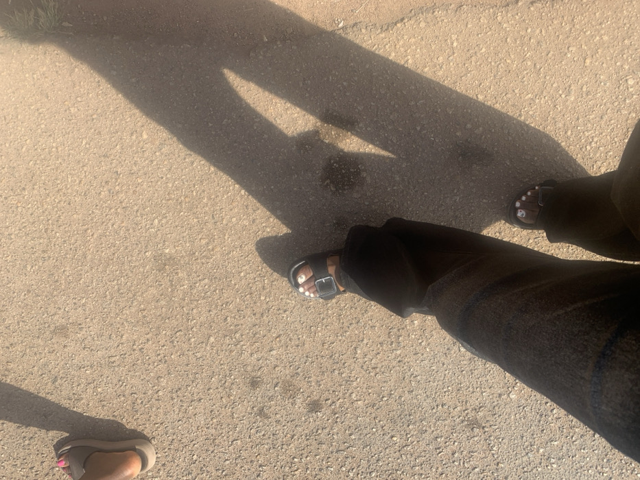 The image displays a high-angle view of the lower extremities of two individuals standing on a light-colored, granular paved surface, consistent with asphalt or concrete, under daylight conditions in Jos, Nigeria. In the lower center and left, the legs and feet of one person are visible. This individual wears dark, possibly black or dark gray, wide-leg trousers. Their feet are clad in black open-toed sandals featuring a prominent buckle strap across the top of the foot. The toenails are painted white. In the upper left quadrant, the left foot of a second individual is partially visible. This foot wears a light-colored, possibly tan or beige, platform-style sandal. The big toenail of this foot is painted pink. Multiple long, dark shadows are cast across the paved surface, originating from the right side of the frame and extending towards the left, indicating a low sun angle. The ground itself shows minor textural variations and several dark, irregular stains. A small patch of green vegetation is discernible along the far right edge of the paved area.
