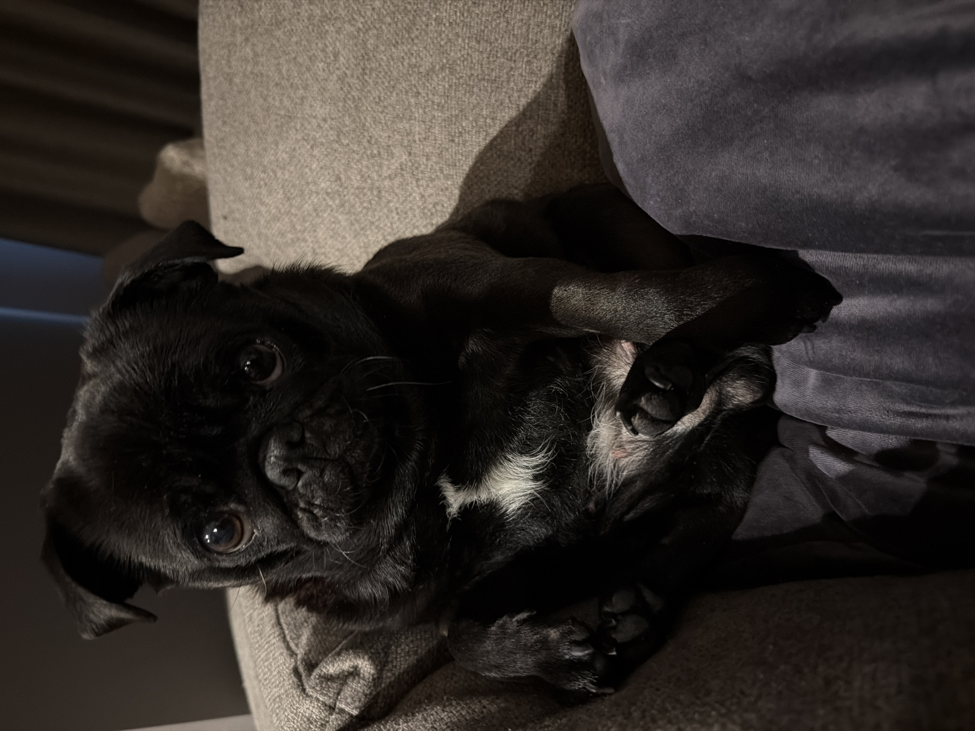 This image depicts a black pug dog in an indoor setting in Razlog, Bulgaria